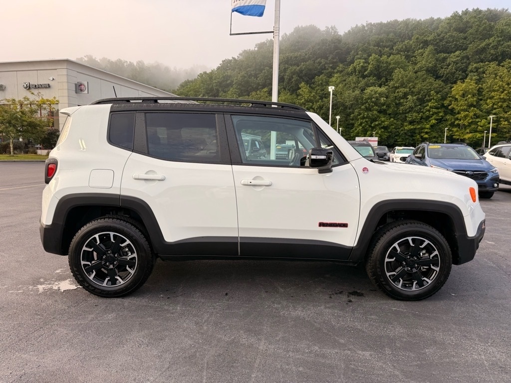 Quick Order Package 22C, Trailer Tow Group (4 Pin Wiring Harness and Class III Receiver Hitch), Trailhawk Elite Group (Front Seat Back Map Pockets, Heated Front Seats, Heated Steering Wheel, Leather Wrapped Steering Wheel, Power 2-Way Driver Lumbar Adjust, Power Adjust 8-Way Driver Seat, and Premium Leather Trimmed Bucket Seats), Renegade Trailhawk, 4D Sport Utility, 1.3L I4, 9-Speed 948TE Automatic, 4WD, Alpine White Clearcoat, Black Leather, 4-Wheel Disc Brakes, 4.585 Final Drive Ratio, 6 Speakers, ABS brakes, Air Conditioning, Alloy wheels, AM/FM radio: SiriusXM, Anti-whiplash front head restraints, Apple CarPlay/Android Auto, Auto-dimming Rear-View mirror, Automatic temperature control, Brake assist, Compass, Delay-off headlights, Driver door bin, Driver vanity mirror, Dual front impact airbags, Dual front side impact airbags, Electronic Stability Control, Emergency communication system: SiriusXM Guardian, Four wheel independent suspension, Front anti-roll bar, Front Bucket Seats, Front Center Armrest, Front dual zone A/C, Front fog lights, Front reading lights, Fully automatic headlights, Heated door mirrors, Illuminated entry, Knee airbag, Leather Shift Knob, Leather steering wheel, Low tire pressure warning, Navigation System, Normal Duty Suspension, Occupant sensing airbag, Outside temperature display, Overhead airbag, Panic alarm, ParkView Rear Back-Up Camera, Passenger door bin, Passenger vanity mirror, Power door mirrors, Power steering, Power windows, Premium Cloth Low-Back Bucket Seats, Radio data system, Radio: Uconnect 4C Nav w/8.4" Display, Rain sensing wipers, Rear anti-roll bar, Rear window defroster, Rear window wiper, Remote keyless entry, Roof rack: rails only, Security system, Speed control, Split folding rear seat, Spoiler, Steering wheel mounted audio controls, Tachometer, Telescoping steering wheel, Tilt steering wheel, Traction control, Trip computer, Turn signal indicator mirrors, Variably intermittent wipers, Voltmeter, and Wheels: 17" x 7" Glossy Black Diamond Cut.