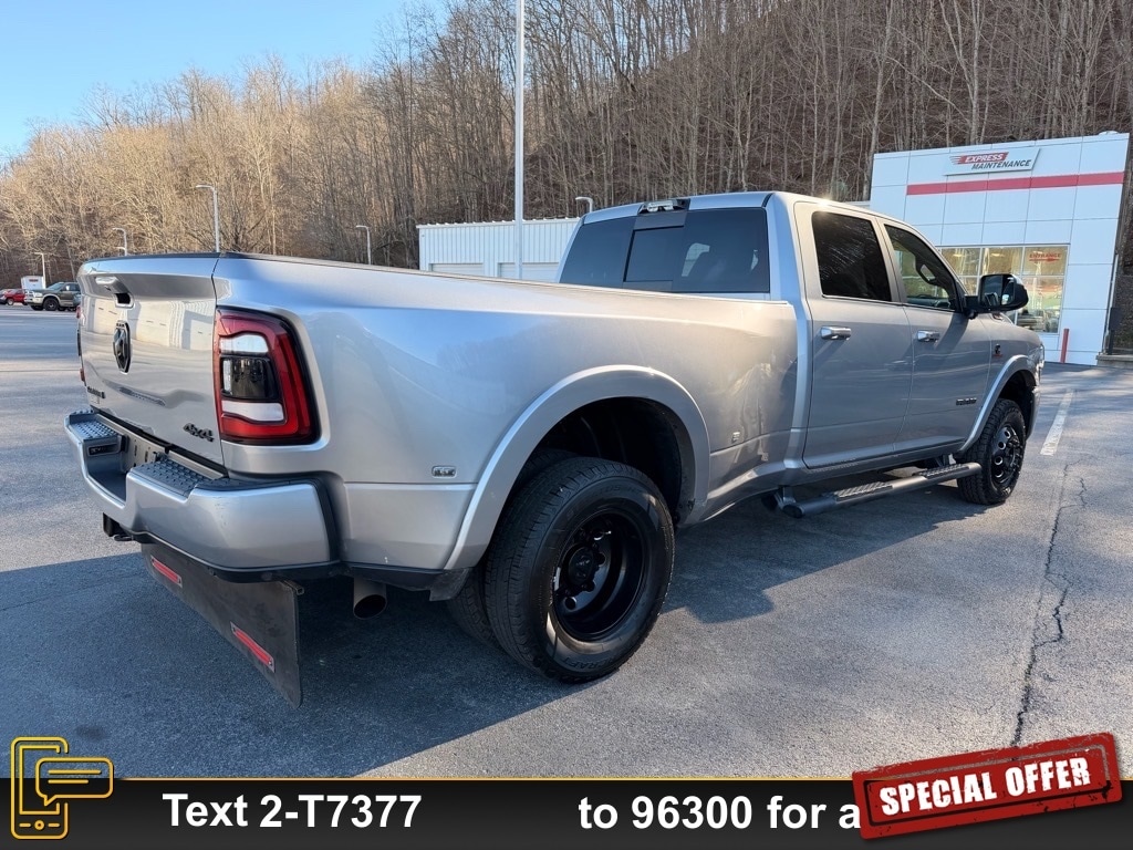 Heavy Duty Snow Plow Prep Group, Laramie Level B Equipment Group (17 Speaker harman kardon Premium Sound, 2nd Row In Floor Storage Bins, 4G LTE Wi-Fi Hot Spot, 8.4" Touchscreen Display, Alexa Built-In, All R1 High Radios, All Radio Equipped Vehicles, Apple CarPlay, Auto High Beam Headlamp Control, Chrome Exterior Mirrors, Connected Travel & Traffic Services, Connectivity - US/Canada, Disassociated Touchscreen Display, Exterior Mirrors w/Memory, Foam Bottle Insert (Door Trim Panel), For Details Visit DriveUconnect.com, For More Info, Call 800-643-2112, Global Telematics Box Module (TBM), Google Android Auto, GPS Antenna Input, GPS Navigation, HD Radio, Heated Second Row Seats, Integrated Center Stack Radio, Integrated Voice Command w/Bluetooth, Mirror-Mounted Aux Reverse Lamps, Off-Road Information Pages, Power Adjustable Convex Aux Mirrors, Power Adjustable Pedals w/Memory, Power Chrome Tow Mirrors w/Convex Spotter & Memory, Radio: Uconnect 5 Nav w/8.4" Display, Radio/Driver Seat/Mirrors/Pedals Memory, Rain Sensitive Windshield Wipers, Remote Tailgate Release, Selectable Tire Fill Alert, SiriusXM Radio Service, SiriusXM Satellite Radio, SiriusXM w/360L, and Ventilated Front Seats), Night Edition (Black Exterior Mirrors, Black Exterior Truck Badging, Black Headlamp Bezels, Black Interior Accents, Black Ram Head Tailgate Badge, Black Tail Lamp Bezels, Black Wheel Center Hub, Body Color Door Handles, Body Color Grille Surround, Exterior Mirrors Courtesy Lamps, Exterior Mirrors w/Heating Element, Exterior Mirrors w/Supplemental Signals, Gloss Black Grille Billets/Accents, Mirror Running Lights, Painted Front Bumper, Painted Rear Bumper, Power Black Tow Mirrors w/Convex Spotter & Memory, and Power-Folding Mirrors), Quick Order Package 21H Laramie, Tow-Mode Digital Rearview Mirror Package (Digital Rearview Mirror), Towing Technology Group B (CTR Stop Lamp w/Cargo View Camera, Surround View Camera System, Trailer Reverse Guidance, and Trailer Tow Mirrors), #1 Seat Foam Cushion, 10 Speakers, 115V Auxiliary Rear Power Outlet, 12" Touchscreen Display, 2 Way Rear Headrest Seat, 220 Amp Alternator, 4 Way Front Headrests, 4-Wheel Disc Brakes, 5th Wheel/Gooseneck Towing Prep Group, 6000# Front Axle w/Hub Ext, ABS brakes, Active Noise Control System, Adaptive Steering System, Adjustable pedals, Air Conditioning, Air Suspension Decal, Alloy wheels, AM/FM radio: SiriusXM, Apple CarPlay/Android Auto, Auto Level Rear Air Suspension, Auto-dimming Rear-View mirror, Automatic temperature control, Bluetooth Handsfree Phone & Audio, Box & Rear Fender Clearance Lamps, Brake assist, Bumpers: chrome, Center Hub, Clearance Lamps, Compass, Delay-off headlights, Driver door bin, Driver vanity mirror, Dual front impact airbags, Dual front side impact airbags, Dual Rear Wheels, Electronic Stability Control, Electronically Controlled Throttle, Folding Flat Load Floor Storage, Front anti-roll bar, Front Bumper Sight Shields, Front Center Armrest w/Storage, Front dual zone A/C, Front fog lights, Front License Plate Bracket, Front reading lights, Front Seat Back Map Pockets, Fully automatic headlights, Garage door transmitter, Heated door mirrors, Heated Front Seats, Heated front seats, Heated Steering Wheel, Heated steering wheel, High Back Seats, Illuminated entry, Leather steering wheel, Leather Trim 40/20/40 Bench Seat, LED Bed Lighting, Low tire pressure warning, MOPAR Front & Rear Rubber Floor Mats, MOPAR Spray In Bedliner, Occupant sensing airbag, Outside temperature display, Overhead airbag, Overhead console, Panic alarm, ParkView Rear Back-Up Camera, Passenger door b