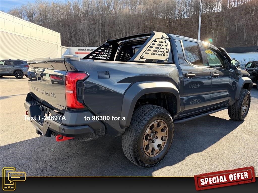 Trailhunter Package, Tacoma Hybrid Trailhunter, 4D Crew Cab, 2.4L I4 PDI Hybrid Turbocharged DOHC 16V, 8-Speed Automatic, 4WD, Underground, Boulder w/SofTex Seat Trim, ABS brakes, Electronic Stability Control, Front dual zone A/C, Gunmetal Tailgate Insert (TMS), Heads-Up Display, Heated & Ventilated Front Bucket Seats, Heated door mirrors, Heated front seats, Illuminated entry, JBL Premium Audio, Low tire pressure warning, Navigation system: Drive Connect (1 year trial) includes Cloud Navigation with real time traffic and Google POI, Power driver seat, Radio: 14" Toyota Audio Multimedia, Remote keyless entry, SofTex Seat Trim, Traction control, Ventilated front seats, Wheels: 18" Bronze-Finished Trailhunter Alloy, 3.583 Axle Ratio, 4-Wheel Disc Brakes, 9 Speakers, Air Conditioning, AM/FM radio: SiriusXM, Anti-whiplash front head restraints, Apple CarPlay/Android Auto, Auto High-beam Headlights, Auto-dimming Rear-View mirror, Automatic temperature control, Brake assist, Bumpers: body-color, Connected Services Trial Offering (1Y) (TMS), Driver door bin, Driver vanity mirror, Dual front impact airbags, Dual front side impact airbags, Emergency communication system: Safety Connect (1-year trial), Exterior Parking Camera Rear, Four wheel independent suspension, Front anti-roll bar, Front Bucket Seats, Front Center Armrest, Front fog lights, Front reading lights, Fully automatic headlights, Garage door transmitter: HomeLink, Heated steering wheel, Knee airbag, Leather Shift Knob, Leather steering wheel, Occupant sensing airbag, Outside temperature display, Overhead airbag, Overhead console, Panic alarm, Passenger door bin, Passenger vanity mirror, Power door mirrors, Power passenger seat, Power steering, Power windows, Rear anti-roll bar, Rear step bumper, Rear window defroster, Security system, Speed control, Speed-sensing steering, Split folding rear seat, Steering wheel mounted audio controls, Tachometer, Telescoping steering wheel, Tilt steering wheel, Trip computer, Turn signal indicator mirrors, and Variably intermittent wipers.